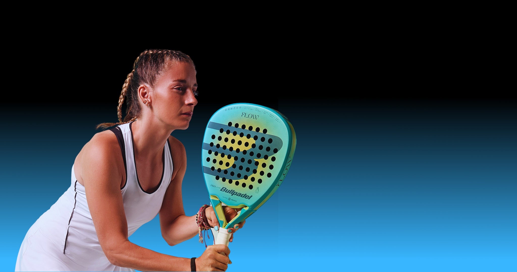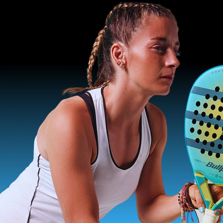 Top Game female padel player with Bullpadel Vertex racket in ready stance