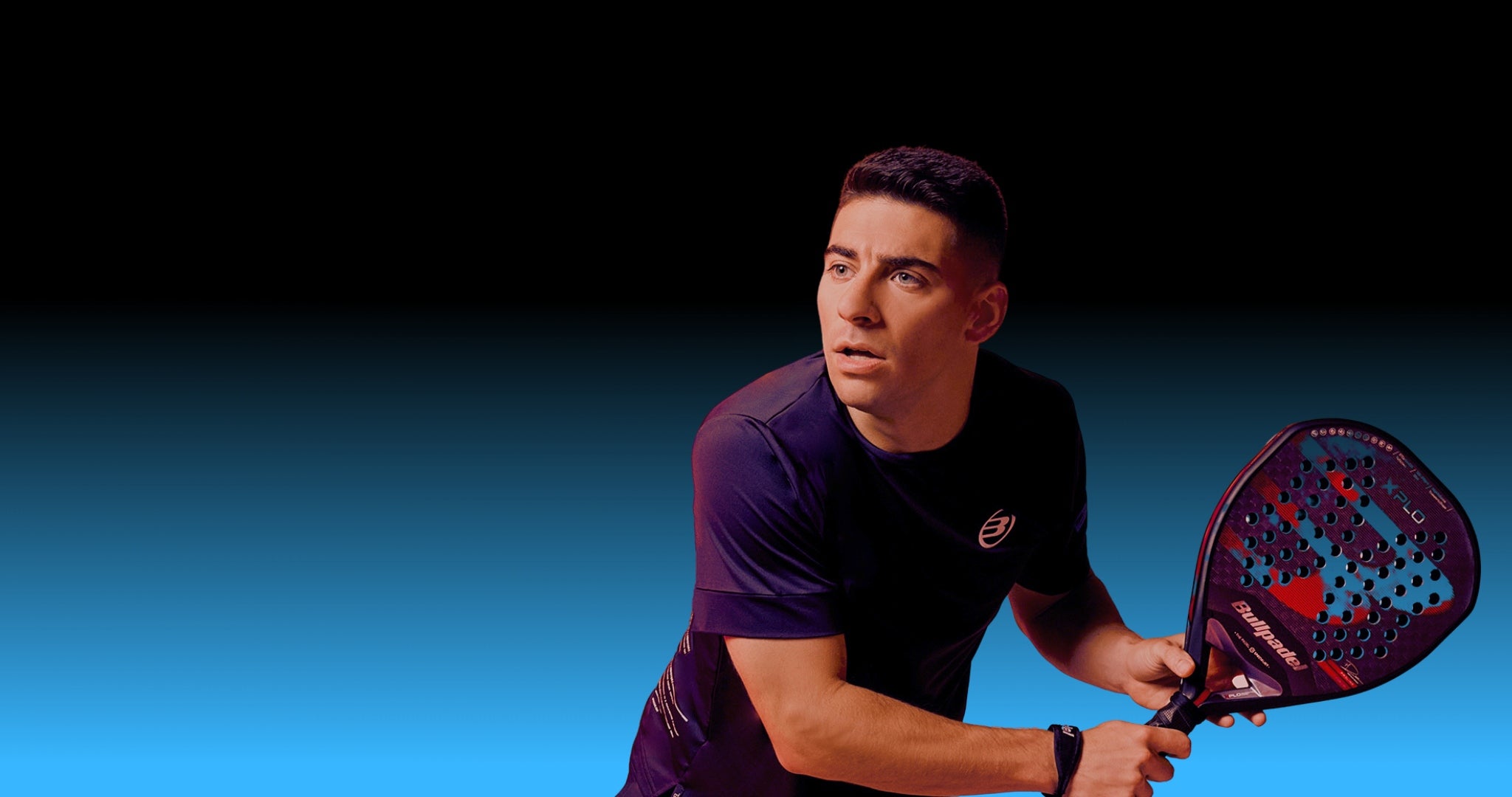 Top Game padel player holding Bullpadel Hack racket in ready stance