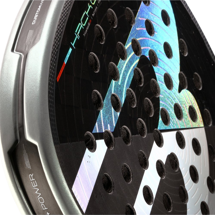 La distribución de agujeros en una pala de pádel desempeña un papel importante en el rendimiento, influenciando factores como el control, la salida de la pelota o la potencia. El nuevo patrón de agujeros en la línea Hack 04 se ha rediseñado con un formato de círculos concéntricos que permite una distribución más equilibrada, una mayor flexibilidad en la cara de la pala, y con ello una mayor salida de bola y un punto dulce más grande.