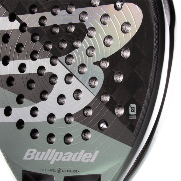 La Bullpadel HACK 04 incorpora una nueva superficie rugosa 3D con círculos concéntricos, diseñada para optimizar los efectos. Al impactar la pelota, este nuevo rugoso, genera una mayor fricción, asegurando un contacto más prolongado y preciso, lo que se traduce en efectos ganadores, tanto en golpes desde el fondo como sutiles cerca de la red.