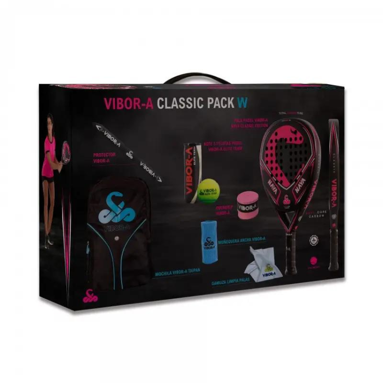 Esta caja incluye el elemento más importante, el modelo Vibor-A Naya Classic, una pala de pádel en forma de lágrima y con caras de carbono 3K. También, incorpora un protector de pala, una gamuza para limpiar la pala y que siempre vaya impecable, una muñequera azul para que tu muñeca no sufra lesiones, un overgrip para mejorar el tacto y la comodidad, un bote de pelotas y la mochila Vibor-A Taipan, para que puedas transportar todo tu equipo con más facilidad y confort.