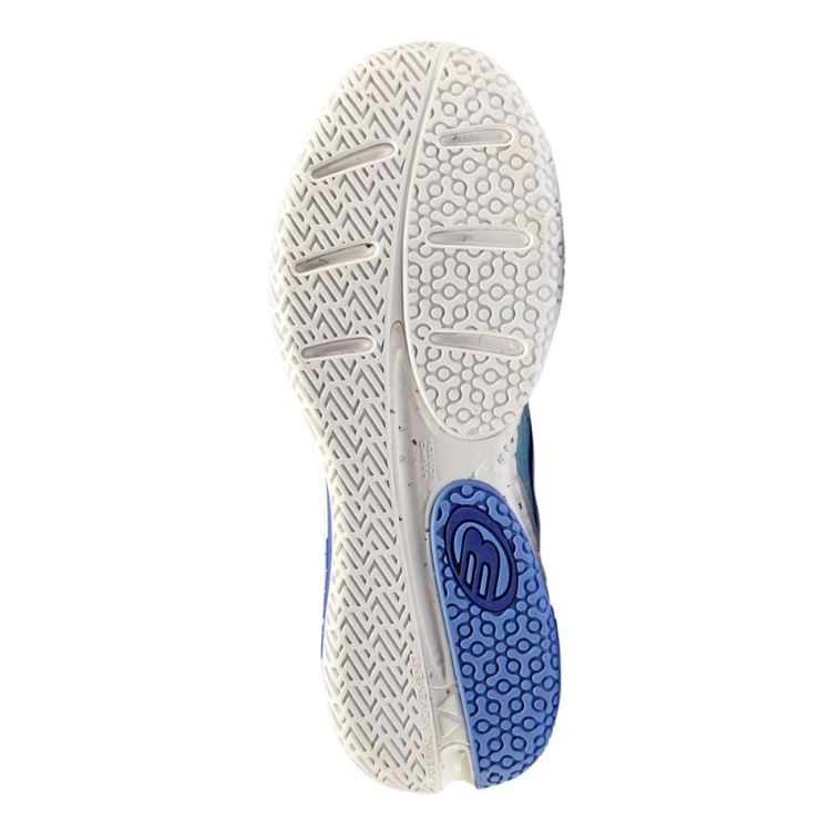 Su suela nos aporta la combinación idónea entre movilidad y agarre, además de la amortiguación requerida durante nuestro juego. Ideal para todo tipo de jugadoras y pistas. Cuenta también con un talón de lycra para mayor confort.